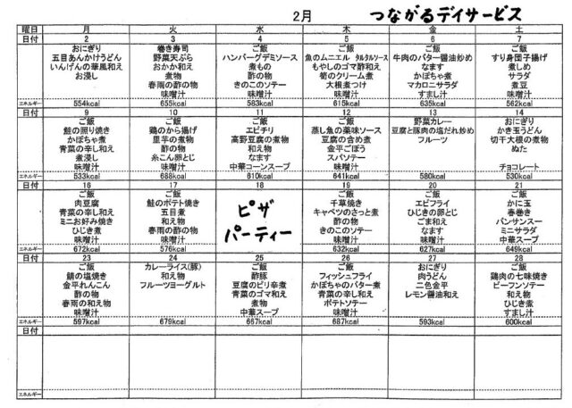 2月のメニュー表を掲載いたしました 2026.01.26 いつも、つながるデイサービスをご利用いただきありがとうございます。 つながるデイサービスにて毎月発行しておりますメニュー表を掲載いたします。 どうぞよろしくお願いいたします。