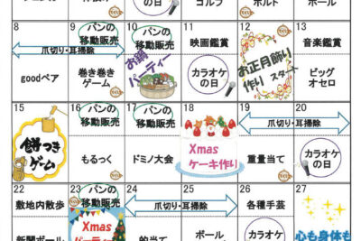 いつもつながるデイサービスをご利用いただきありがとうございます。12月のレクリエーション月間計画表を掲載いたします。どうぞよろしくお願いいたします。